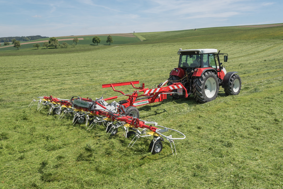 Die leichtzügigen PÖTTINGER Schwader mit perfekter Bodenanpassung und extremer Wendigkeit entsprechen den hohen Anforderungen der Praxis. Schwaden mit geringsten Bröckelverlusten und minimaler Verschmutzung sichert energiereiches Futter und wirtschaftlichen Grundfuttereinsatz.